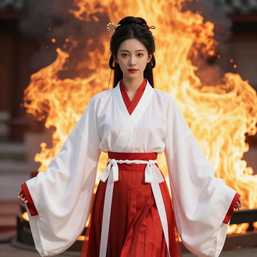 Masterpiece, best quality, realistic, fire background, 1girl, hanfu, tang style outfits, white short coat, red chest pleated skirt, white waistband