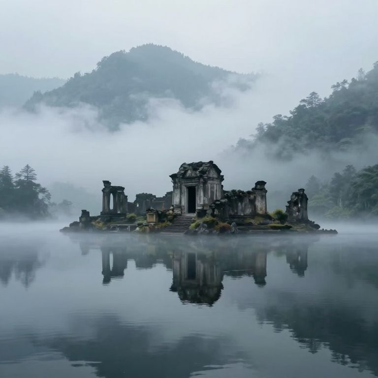 Serenity whispers through the misty embrace of mountains and mirrored waters, where ancient ruins stand as silent witnesses to the eternal dance between obscurity and revelation.
