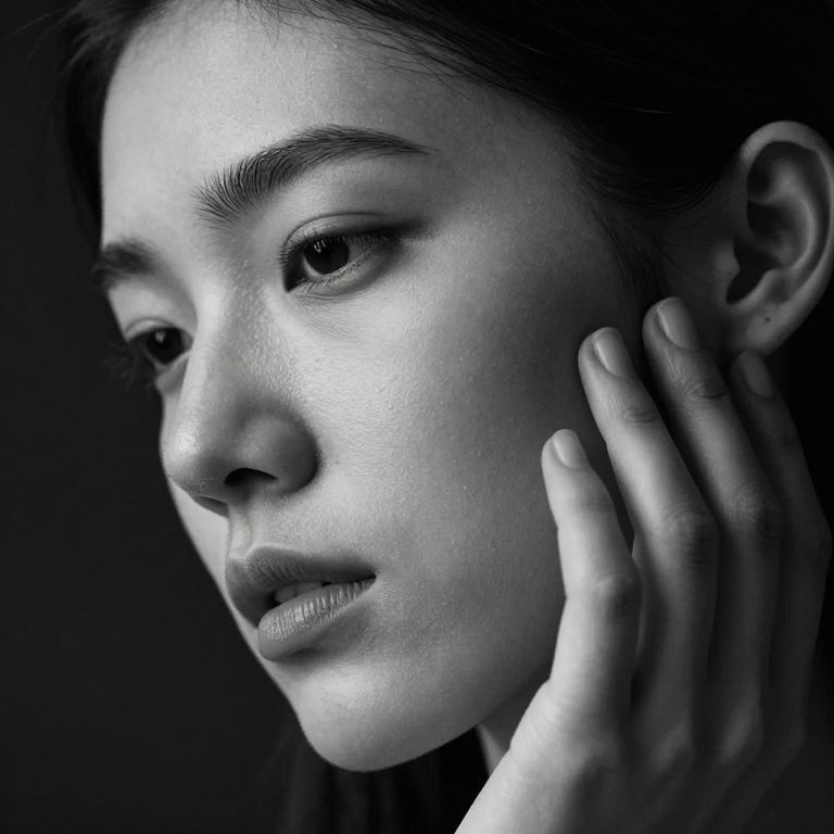Caress cheek captured in monochrome, dramatic lighting highlighting contours, intimate connection portrayed through subtle touch, artistic and emotive portrait