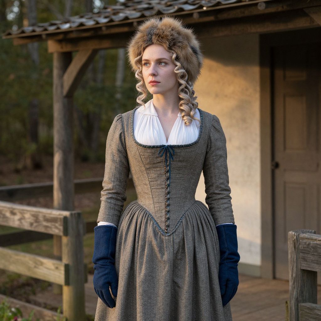 Portrait-style photography of a realistic 18th-century woman in a vintage colonial-era travel costume, dressed in a fitted woolen bodice with a high collar, long pleated skirt, and dark blue woolen gloves, wearing a beaver-fur trimmed hat, standing outside a colonial farm cottage at golden hour, the background shows a forest edge and wooden railings, her face is elegant with a thoughtful expression, pale skin, fair curls gently falling over her shoulders, natural lighting enhancing the textures of the gloves and fabric.. The woman has big tits and cute face
