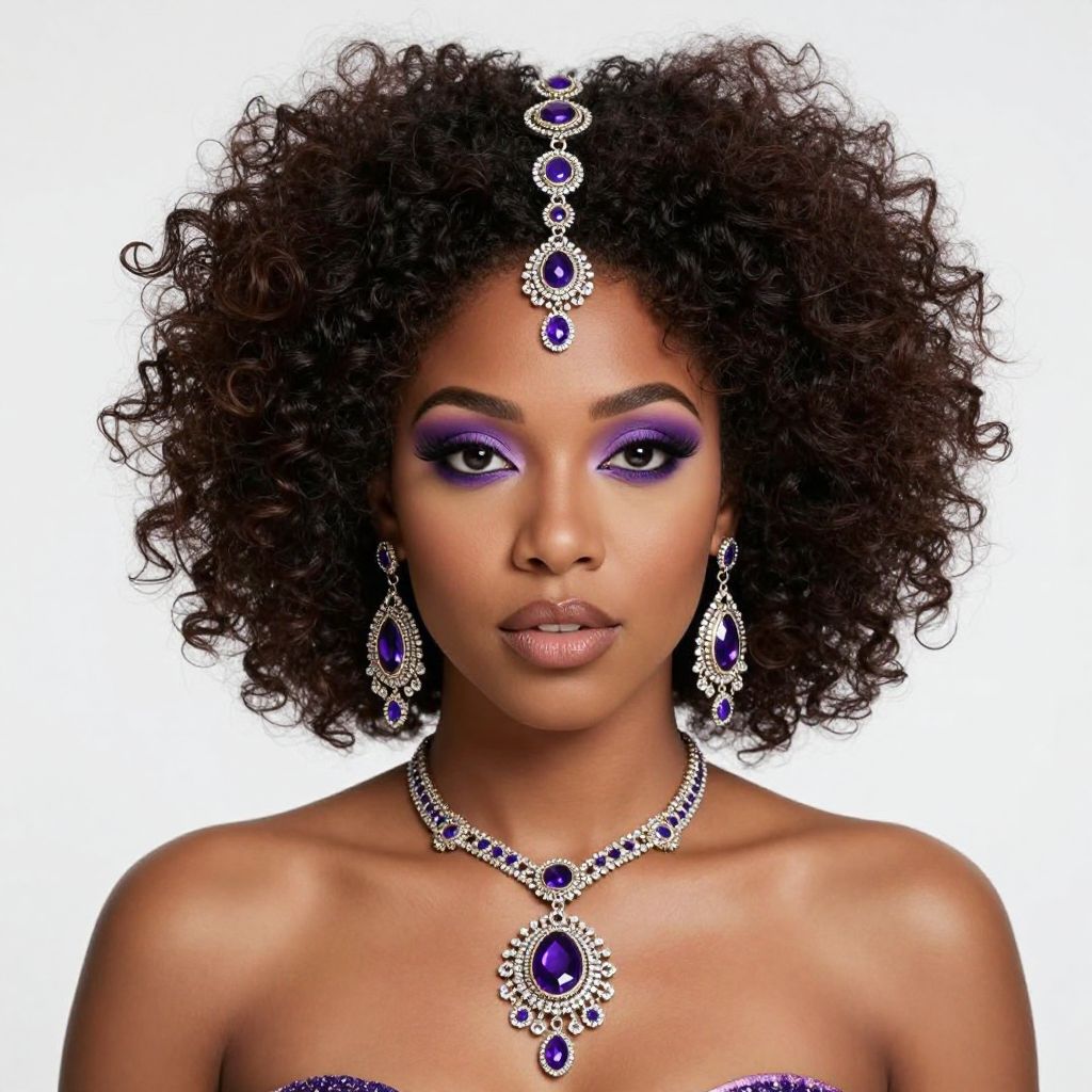 Photograph of a beautiful Black woman with a voluminous, curly afro hairstyle, wearing elaborate jewelry. She has deep purple eyeshadow, full lips, and a neutral expression. Her outfit is not visible, but she wears a sparkling necklace and matching earrings with large, oval-shaped purple gemstones. A similar gemstone is centered on a headpiece that sits on her forehead. The background is plain white, highlighting her striking features and luxurious accessories. The image has a high-fashion, editorial style, emphasizing glamour and elegance.
