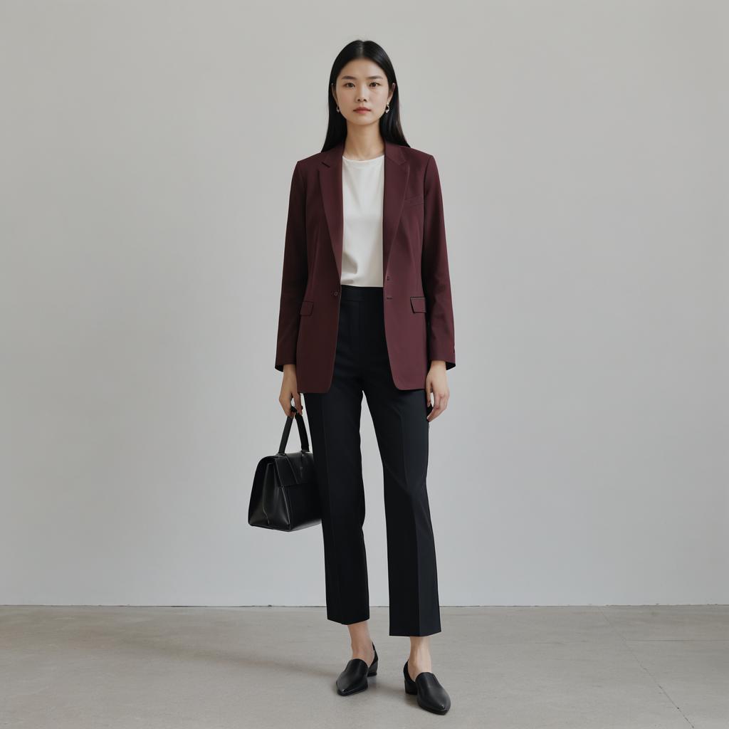 Full-length portrait of an East Asian woman with long straight black hair wearing a tailored maroon blazer over a white cotton t-shirt, paired with black slim-fit modal trousers and black leather chunky mules. She stands against a plain neutral background, holding a small black clutch in one hand and the other hand in her pocket, embodying minimalist and modern understated elegance.