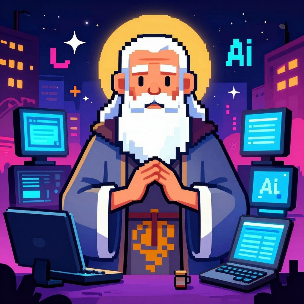 Pixel art of a bald, bearded saint in brown robes, sitting cross-legged, using a laptop, surrounded by screens and a neon cityscape.