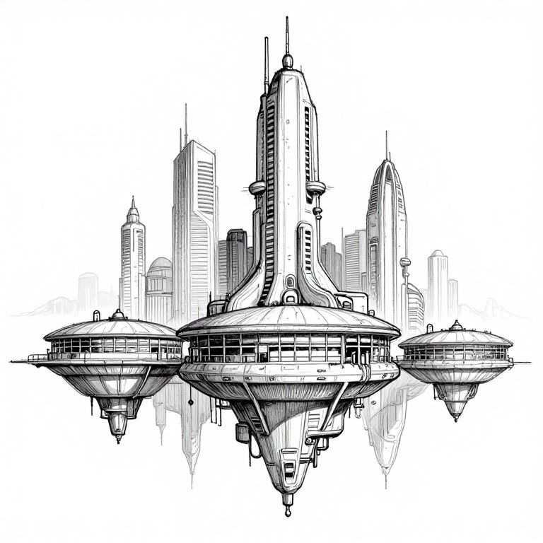 Plain black and white sketch of floating gas stations futuristic metropolis, low angle view, j.c. Lyendecker,