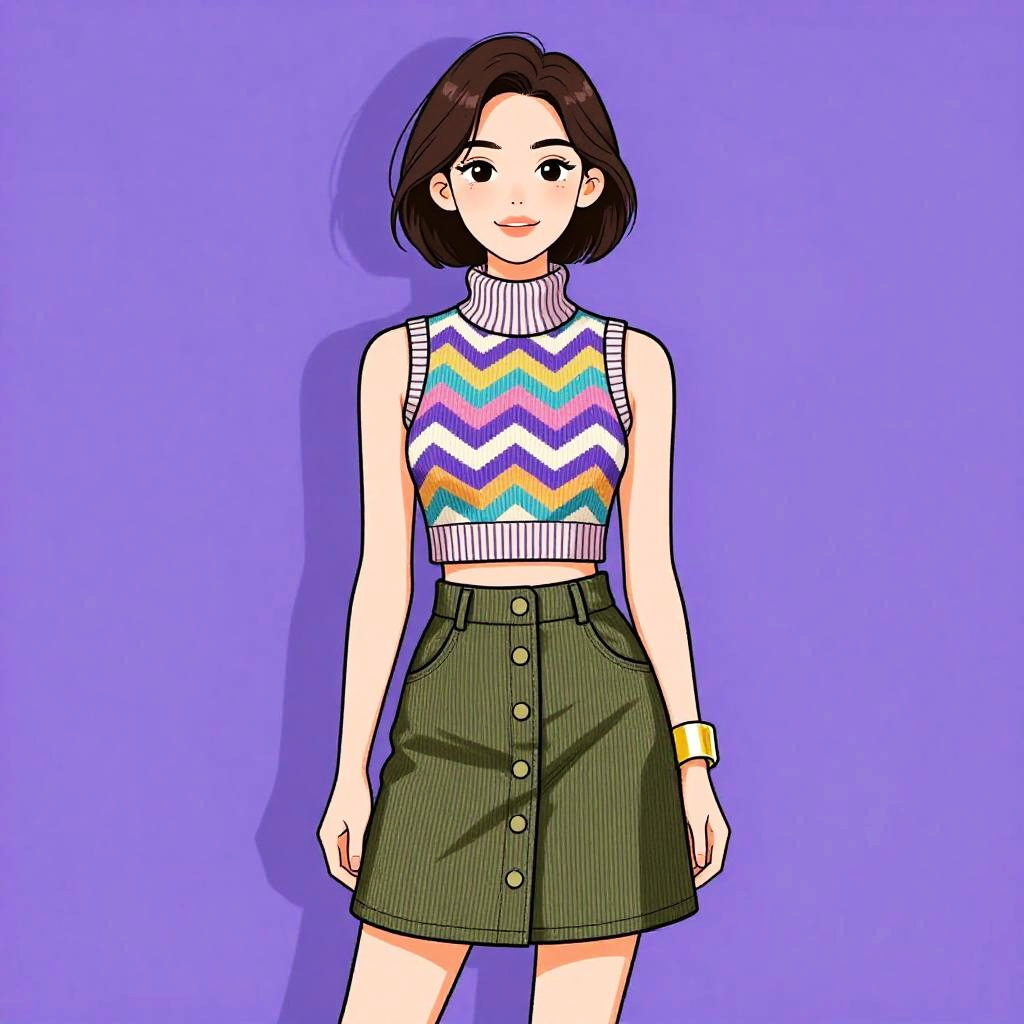 This digital drawing features a young woman with a short, dark brown bob haircut, standing against a solid purple background. She wears a sleeveless, cropped, white knit top with a colorful zigzag pattern in purple, blue, yellow, and white across the chest. Her high-waisted, olive green button-down skirt has a vertical stripe pattern and reaches just above her knees. She accessorizes with a gold bracelet on her right wrist. The art style is colorful and cartoon-like, with bold outlines and flat colors, giving it a modern, graphic feel. The woman's expression is neutral, and she stands with her arms relaxed by her sides.