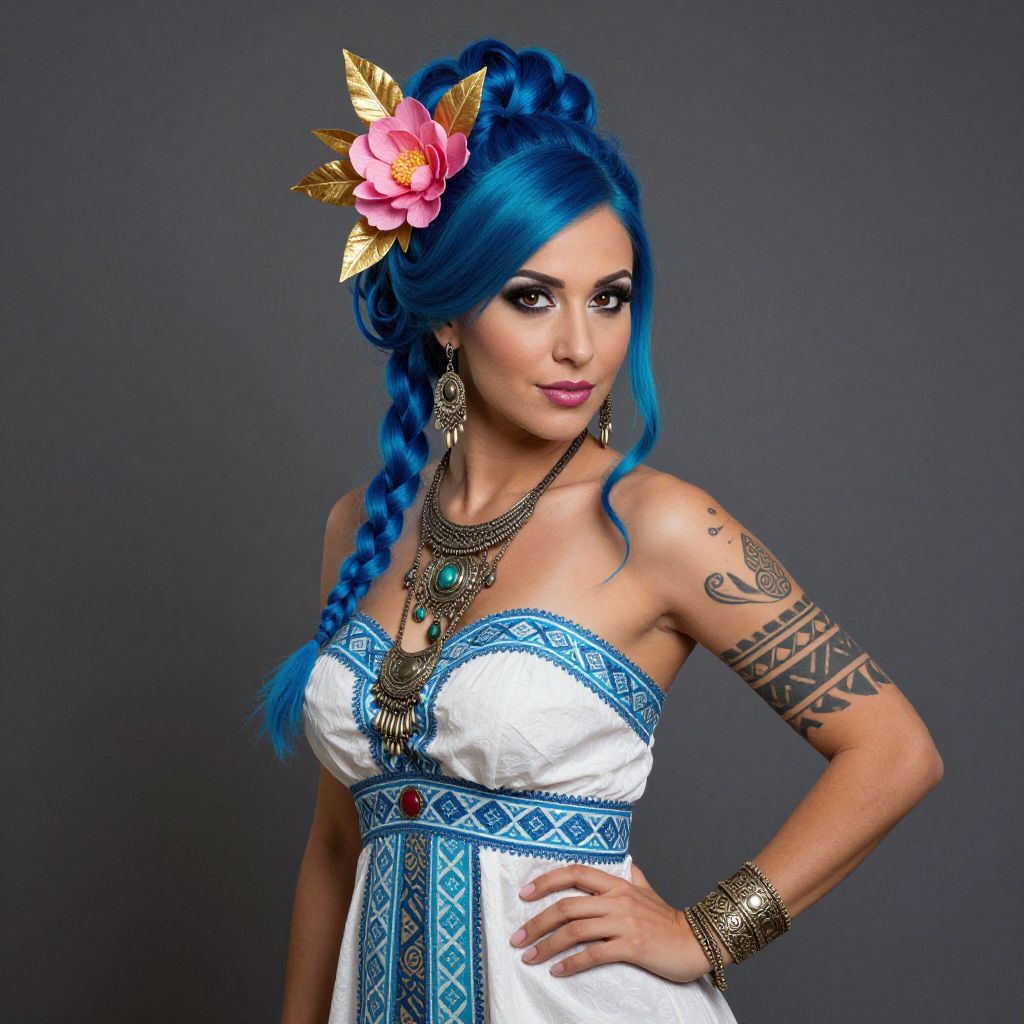 A striking digital portrait of a confident woman with vibrant blue hair styled in an updo adorned with a pink flower and golden leaves. She wears a white dress with intricate blue patterns, complemented by tribal tattoos on her arm and ornate jewelry, blending fantasy and historical elements in a vivid, painterly style.