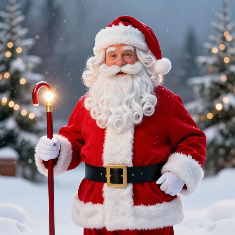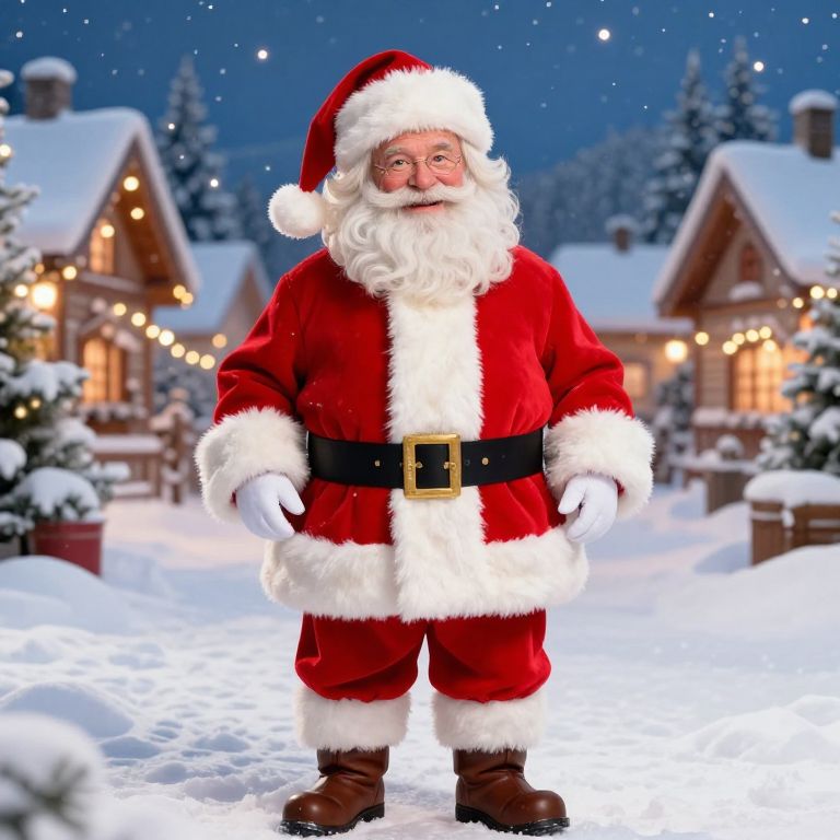 A graceful female Santa Claus in a classic red and white festive outfit, with a traditional round hat adorned with a white beard and a red scarf tied around her neck. She wears white gloves that extend to her wrists, red leather boots that give her a sturdy, joyful presence, and a warm, smiling expression. The background is a snowy, cozy Christmas village with twinkling lights, pine trees, and a soft winter sky. The scene is bright, whimsical, and full of holiday cheer.