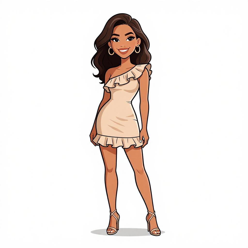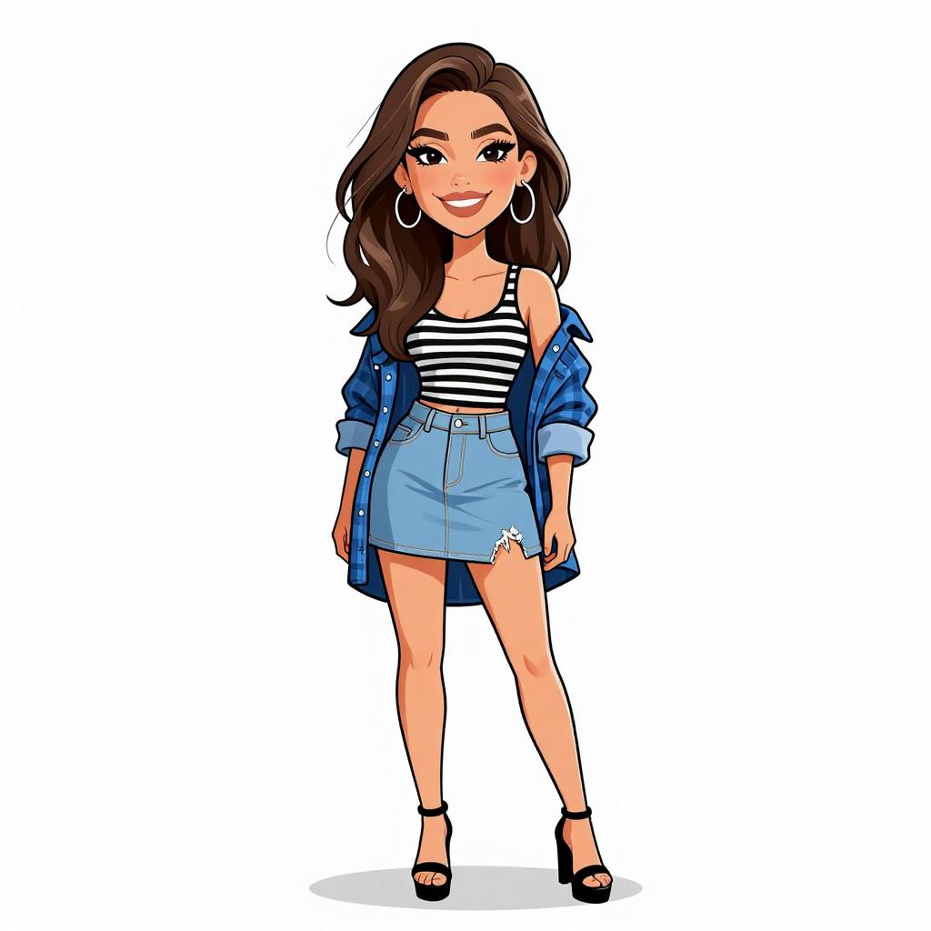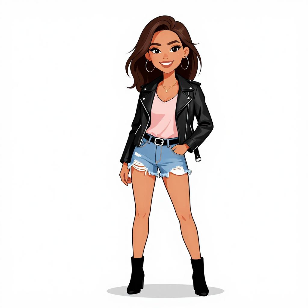 Woman with pretty face and pretty hair. smiling Woman, edgy streetwear, transparent raincoat with long sleeves, black bandeau top underneath, high-waisted black shorts with a lace-up front, thigh-high slit on the raincoat, black ankle strap heels, white studio background. --sref 1467