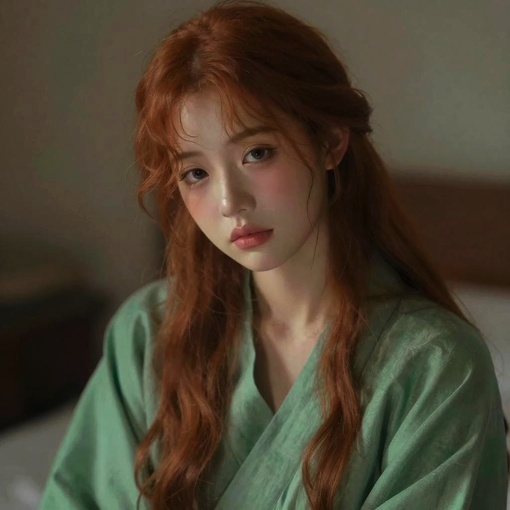 Soft anime‑style digital painting of a beautiful young androgynous adult with long flowing auburn hair and expressive eyes, wearing a draped emerald garment, gently illuminated by diffused light in a muted, enclosed setting, her gaze direct and emotional, detailed facial features and soft textures with pastel highlights, conveying a mood of quiet vulnerability and intimacy