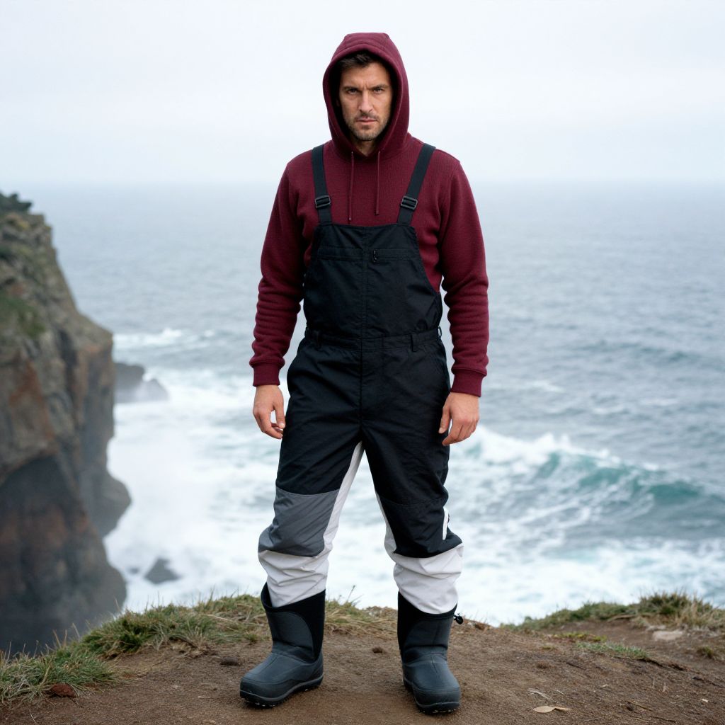 A man, burgundy thermal hoodie, sleek black snowboard overalls, insulated gray snow boots, breathable white base layer, coastal cliff edge, crashing waves below, 3M ferrania analog film stock, focused expression, adventurous spirit. Man has masculine face and piercing eyes