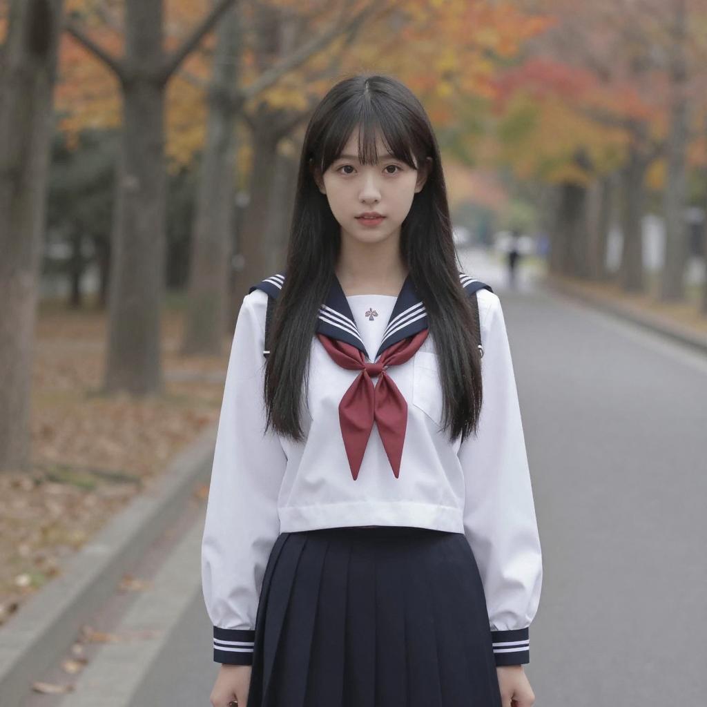 A young woman dressed in a traditional Japanese school uniform poses outdoors along a tree-lined path with autumn foliage. Her long black hair and the setting create a serene and crisp atmosphere reminiscent of classic school portrait photography.