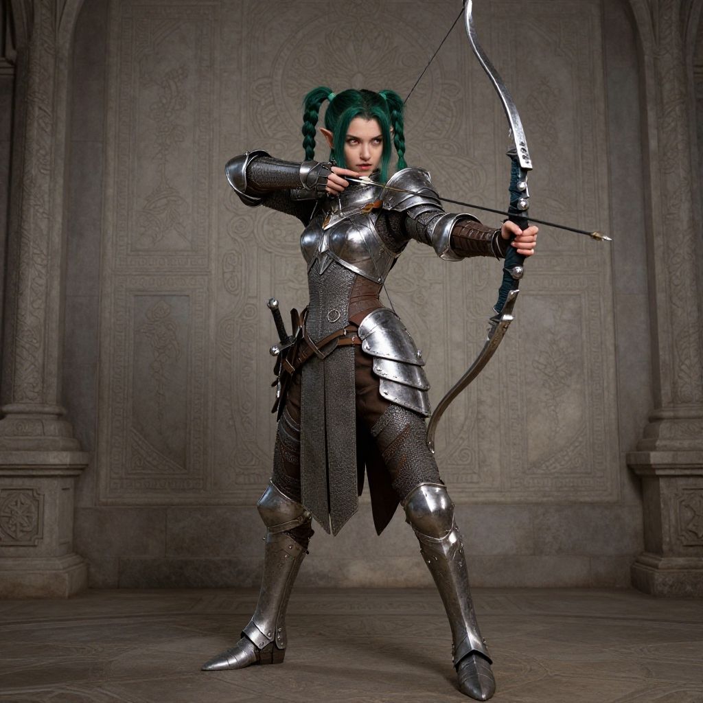 (score_9, score_8_up:1.1), score_7_ up, highly detailed, realistic, photorealistic, zPDXL, (1 girl) slender, petite, Goblin girl, emerald green hair, braided pigtails, twisted fingers, playful expression, young adult, piercing red eyes with unique beautiful face, (she wear Valiant knightess' armor, chainmail, surcoat, helmet, shield, sword, spurs.), she wield medieval fantasy weapon, Elven Shortbow - Agile and compact, designed for swift draws and rapid shooting., dynamic pose, detialed background, masterpeice, detailed, intricated details, 8k, ultraclear, wide angle, detailed scene, detailed faces, perfect quality, tranding on artstation, incredible details, Painstaking Attention To Details