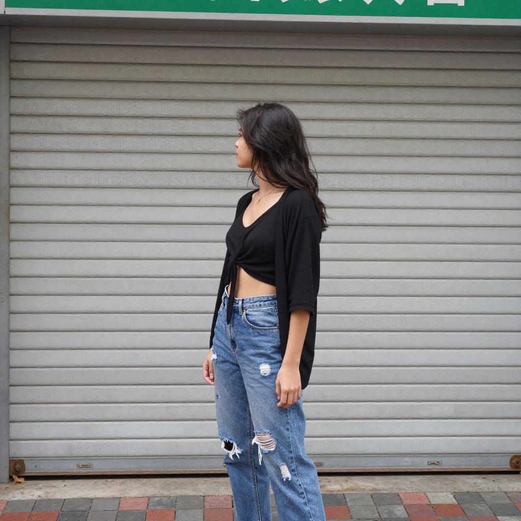 Photograph of a young woman with long, dark hair standing in profile. She wears a black, tied-up crop top revealing her midriff and high-waisted, blue, ripped jeans. Her black cardigan is partially off her shoulders. She stands in front of a closed, silver, horizontal-ribbed metal shutter with a green sign above. The ground is paved with red and gray bricks.