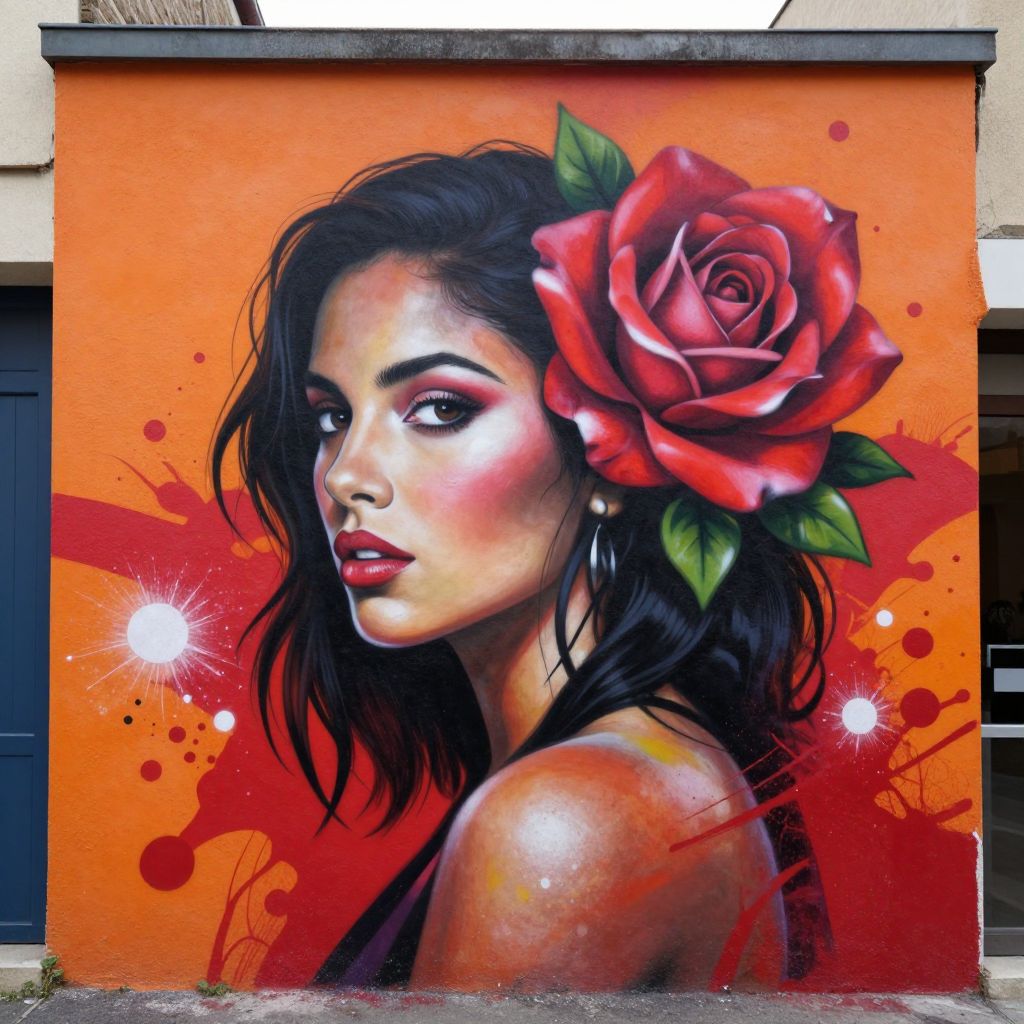 Vibrant street art of a beautiful woman with dark hair, red rose in hair, red off-shoulder top, against orange splash background.