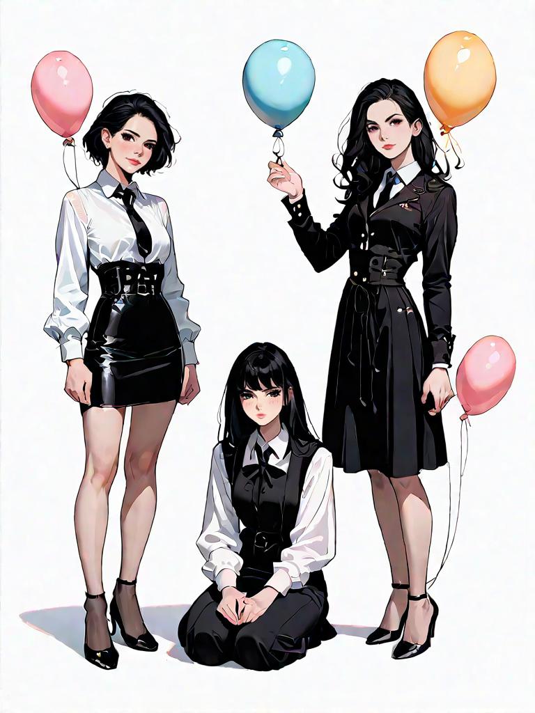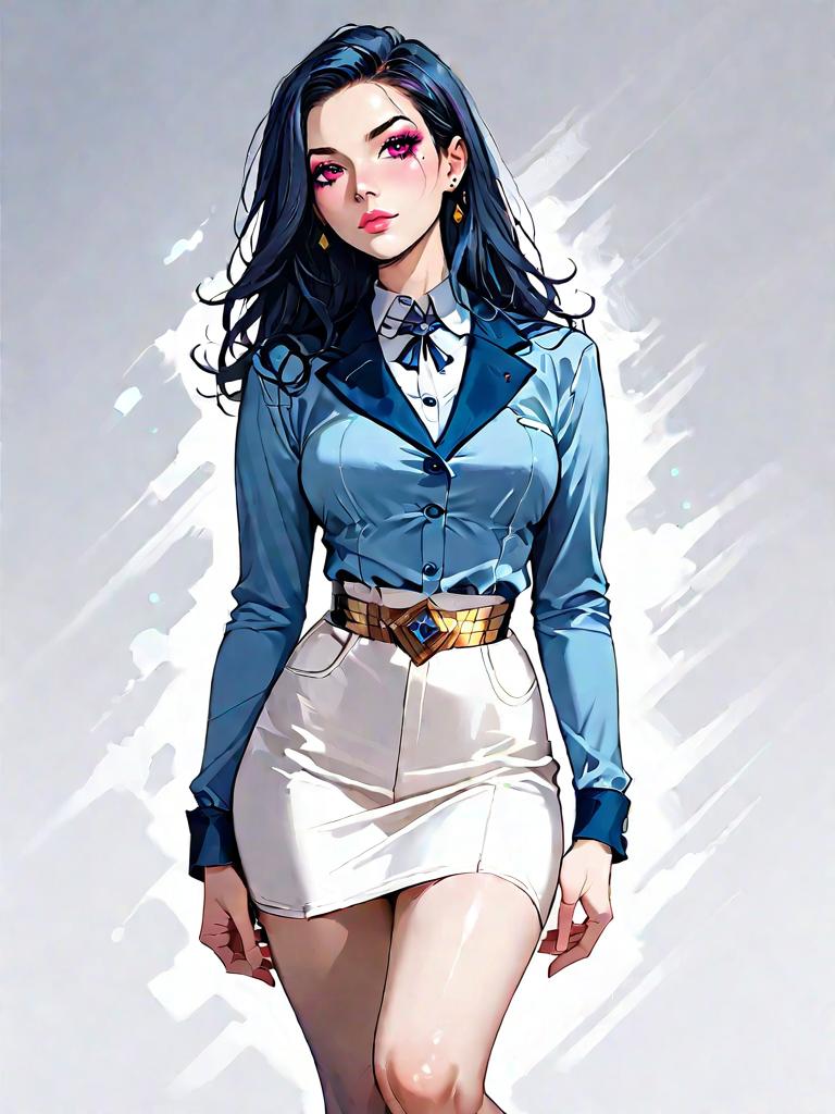 1girl, source_comics, realistic face, full body shot, Woman, contemporary casual, charcoal gauzy blouse with lace inserts, deep v-neckline, gathered empire waist, long balloon sleeves with tie details at the cuffs, paired with a high-waisted gingham pencil skirt in lime green and white, knee-length with a snug fit, plain white background.