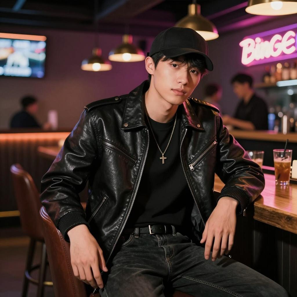 Photograph of a young Asian man with short black hair, standing under an overpass. He wears a brown leather jacket, white shirt, and black pants. His right hand rests on a railing. Background: multi-story building with rows of balconies. Overcast sky. Man has a neutral expression. Urban setting.