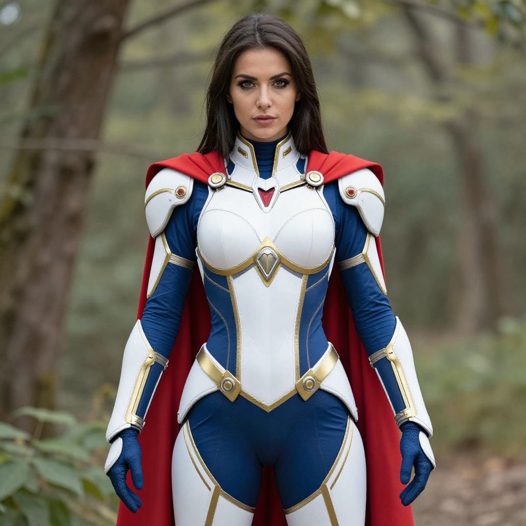 Photorealistic image of a dark-haired woman in a white, blue, and gold superhero suit with a red cape, standing in a forest.