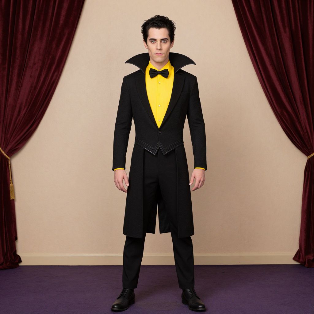 Costume Hotel Transylvania Costume, male in a black and yellow costume standing in front of a stage curtain