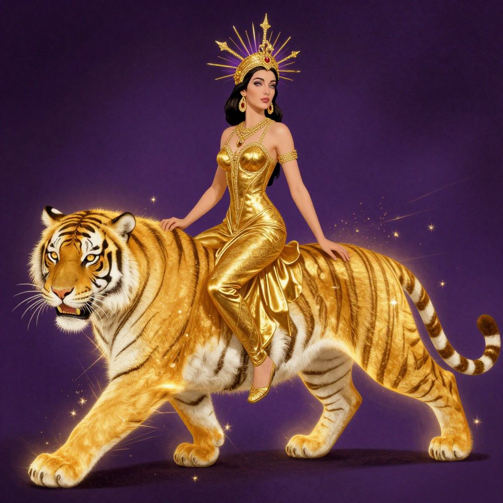 Digital artwork of a regal woman in a gold dress and crown, riding a glowing golden tiger against a purple background.