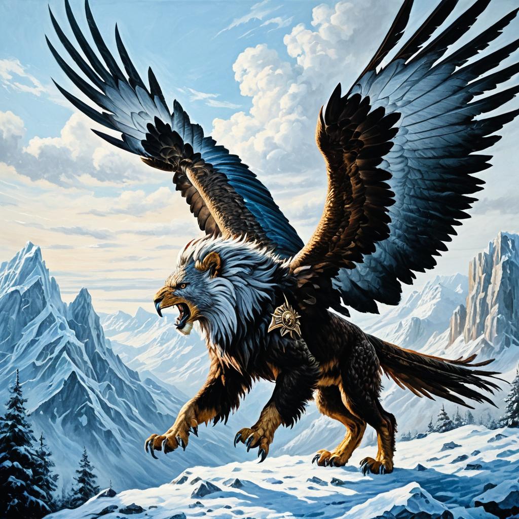 Oil painting depicting a majestic griffon with the body of a lion and the head of an eagle, captured mid-flight or preparing to take off against a serene winter mountain backdrop. The scene features icy blue and pale gray hues with crisp morning light illuminating snow-covered rocks and distant peaks. The griffon’s detailed feathers and fur are richly textured, emphasizing its powerful and mythical presence in a fantasy setting.