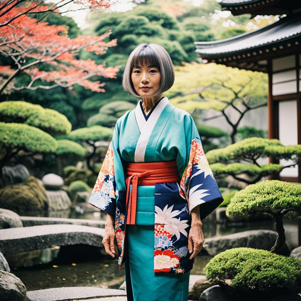 Elderly Woman in Red Kimono in Misty Bamboo Forest