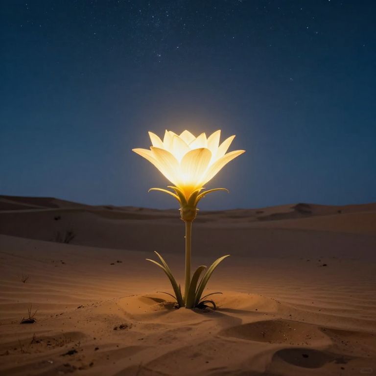 In a desolate desert under a starlit sky, a luminous flower blooms defiantly, its radiant petals glowing like a beacon amidst the endless dunes, defying the barren landscape below.