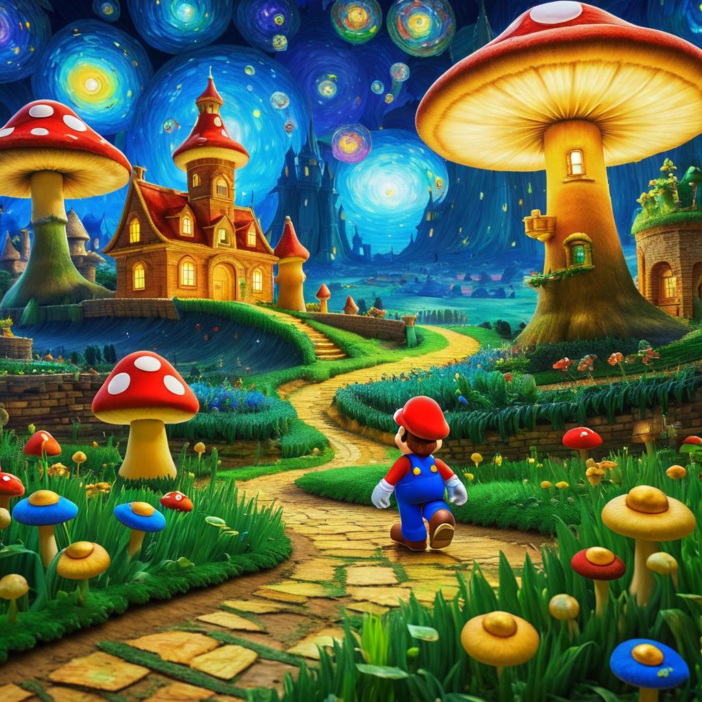 Mario in Mushroom Kingdom painted by Vincent van Gogh, masterpiece in 8K.