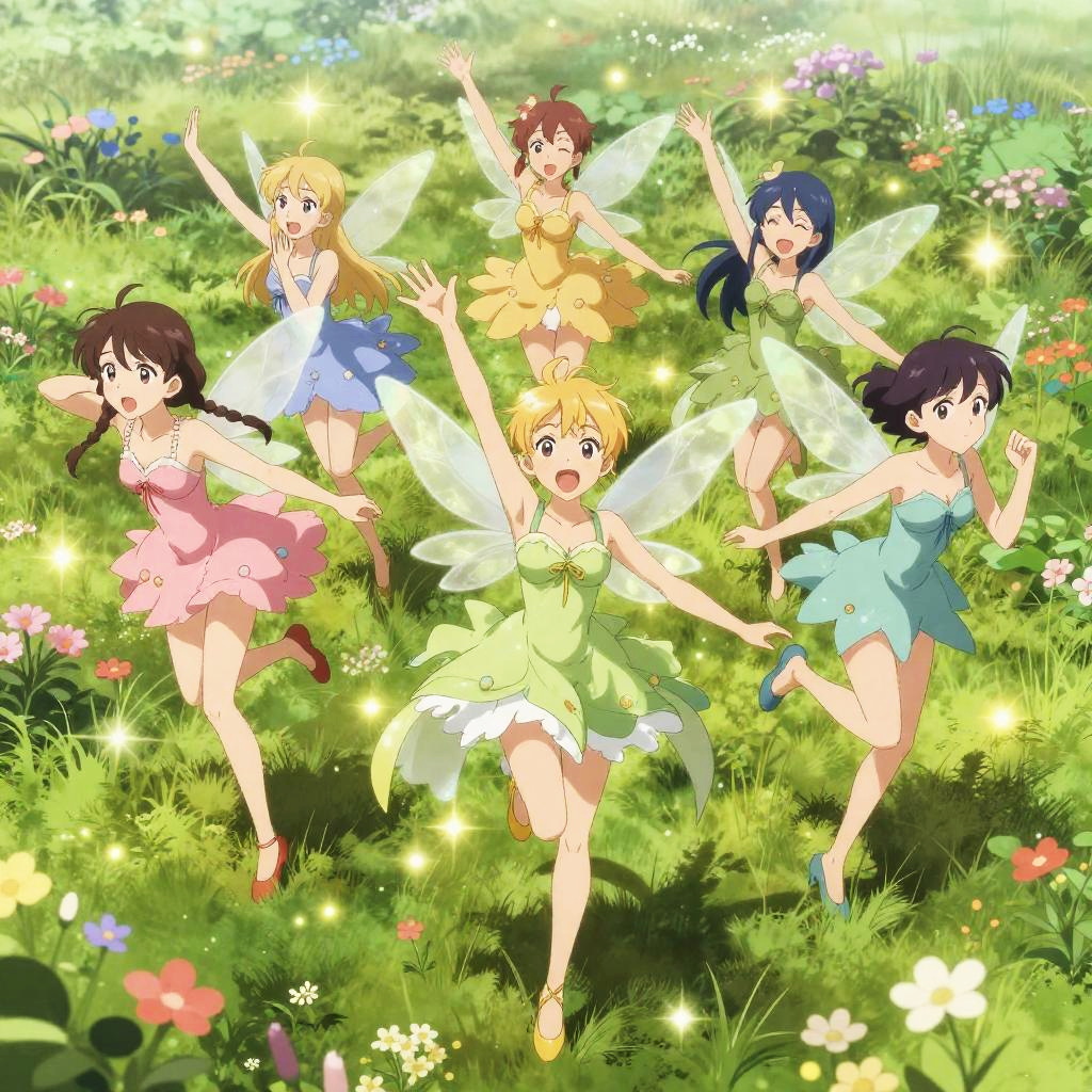 Realistic photo.a band of mischievous fairies, each with delicate wings and enchanting dresses, striking playful poses in mid-flight, in a magical meadow filled with blooming flowers and twinkling lights, depicted in the dynamic and empowering anime style of Jitsuna Kamikita. realistic photo