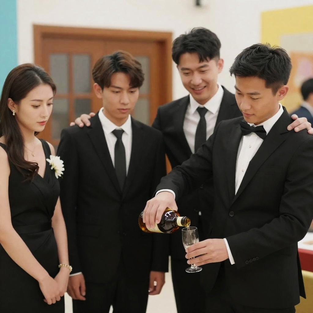 Photograph of four people in formal black suits. One man pours from a bottle into a glass, focused on task. Second man observes with a smile. Third man stands behind, resting arm on first man's shoulder. Woman in black dress, white flower on left, looks down. Background: blurred indoor setting with wooden furniture and bright colors.