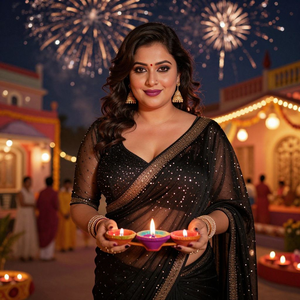 A vibrant festival scene featuring a woman with a round face and dark wavy hair wearing a black glitter saree during Diwali, her face illuminated by colorful diyas, with a backdrop of fireworks and decorated homes, the costume glowing in the festive atmosphere.. The woman has big tits and cute face