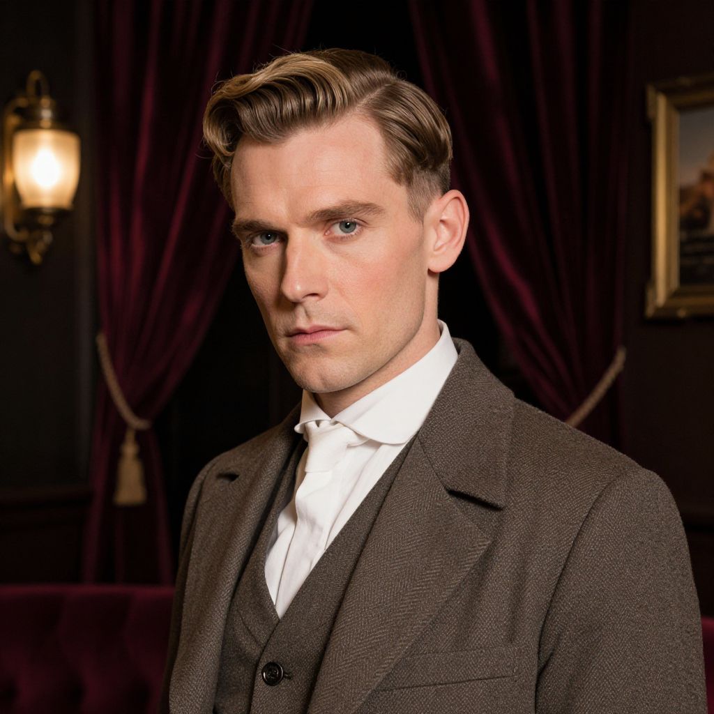 A male performer with a half wig and a classic 1940s spy costume poses in a dark, vintage-themed lounge with velvet curtains and vintage decor; the half wig is neatly combed on the right side, and the man has a chiseled face with sharp cheekbones, pale skin, and a calm, confident look