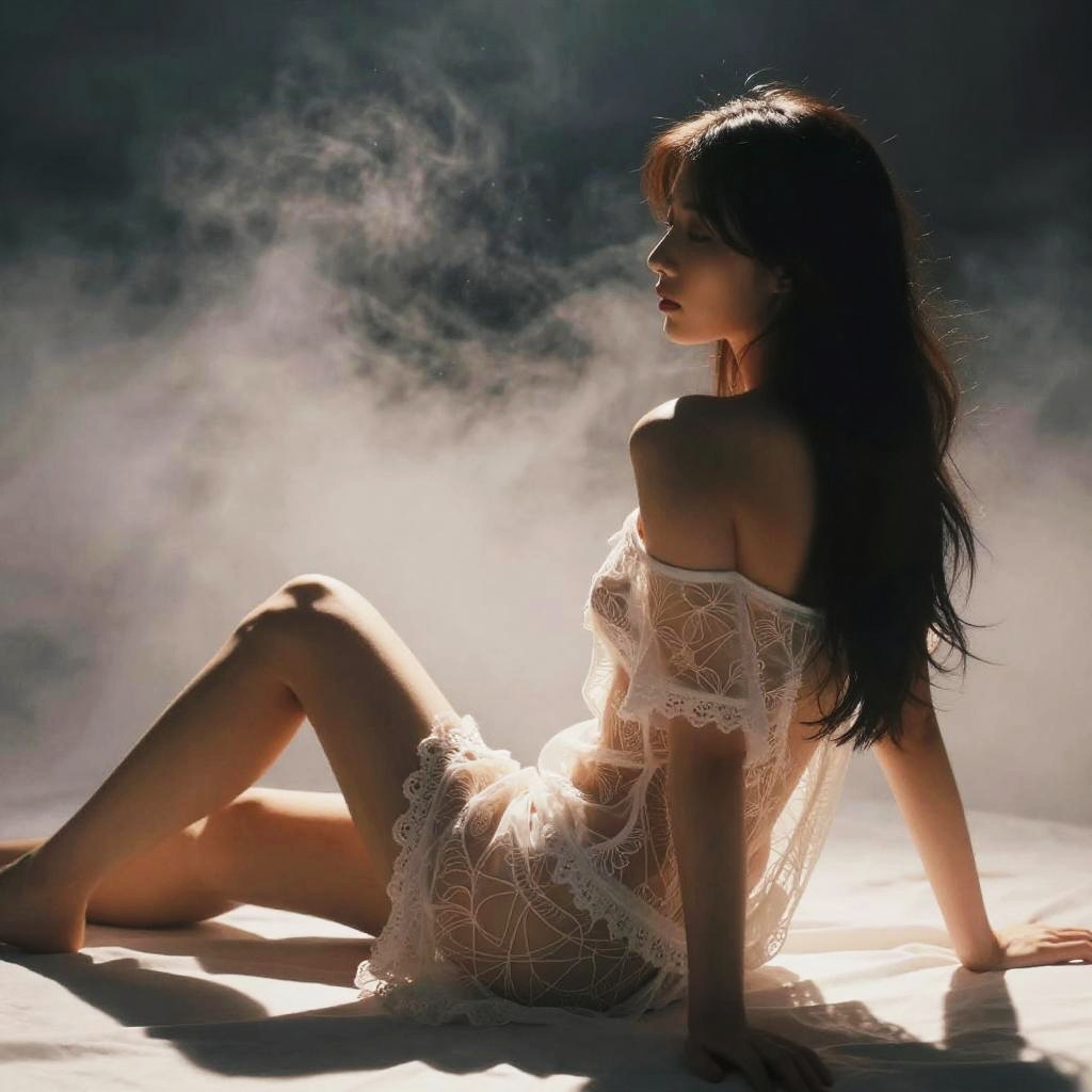 Profile of a young woman sitting on the floor, wearing sheer lace lingerie with off-shoulder sleeves. The image features dramatic lighting with sharp shadows, volumetric fog, and a soft focus background, creating a tranquil and intimate atmosphere. The scene has a warm and cool tone contrast, captured in high resolution with film grain effect.