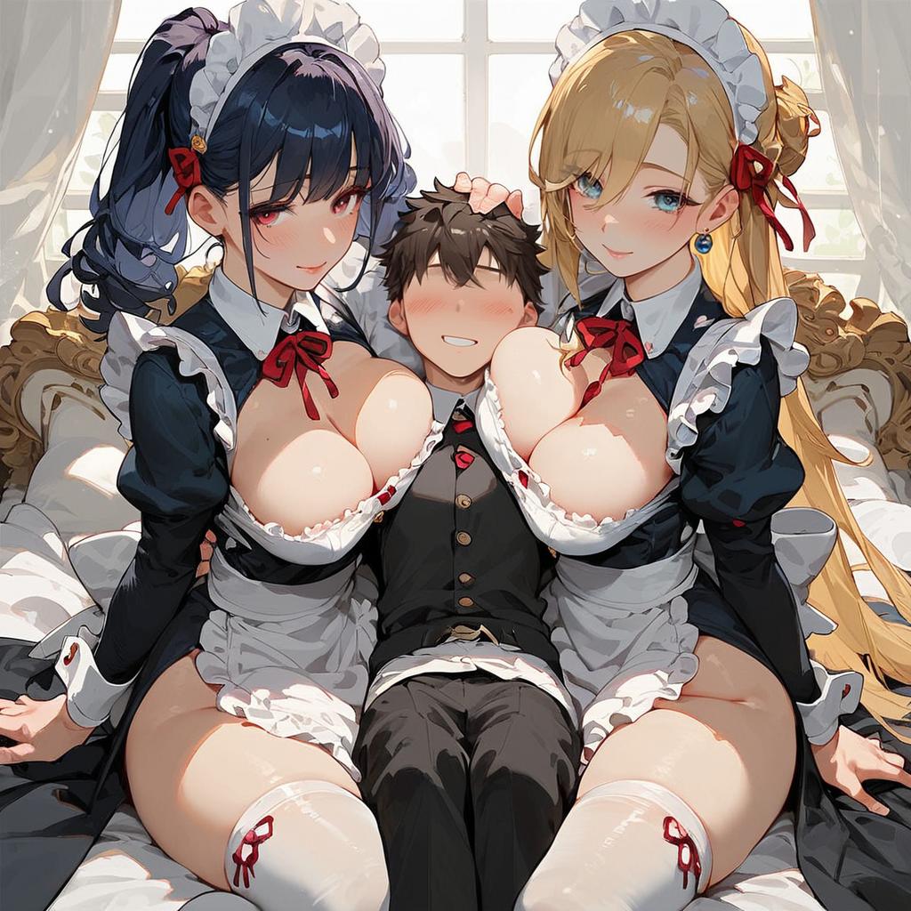 Score_9, score_8_up, score_7_up, source_anime, multiple girls, 1boy, maids and master, maid, faceless male, breasts, breast press, harem, sitting, thighhighs, looking at viewer, blush, smile, pimp, rating_questionable