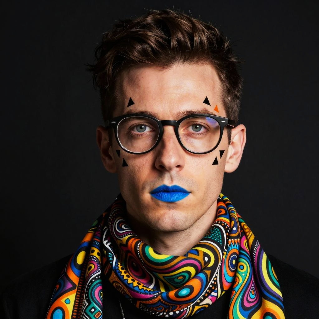 Portrait of a young man with fair skin and brown hair wearing black-rimmed glasses. He has blue lipstick and small black and orange triangle designs on his face. He is dressed in a colorful psychedelic-patterned scarf against a black background.