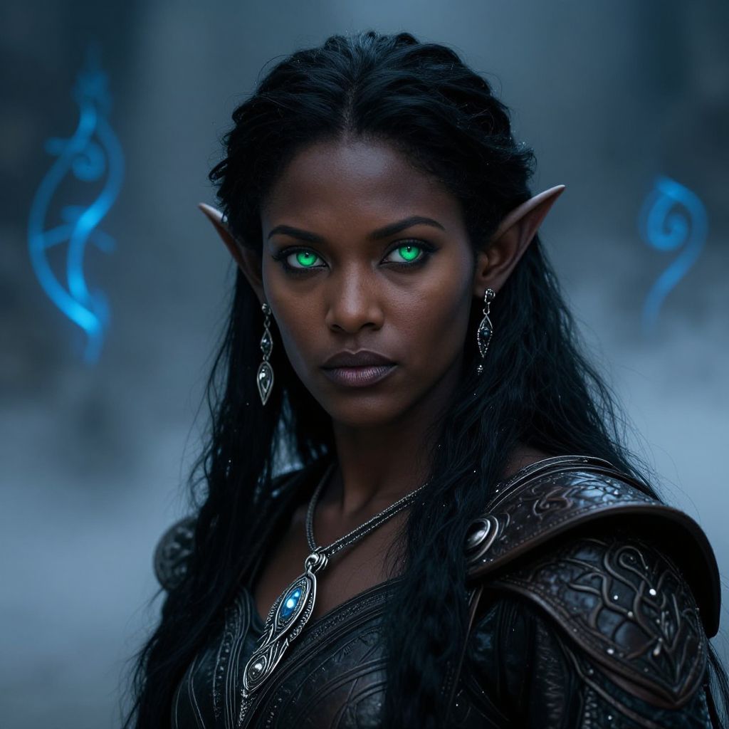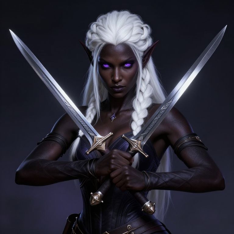 D&D female drow portrait, fierce dark elf warrior, dual wielding daggers, ebony skin, braided white hair, enchanting purple eyes, fantasy RPG character art, detailed and atmospheric