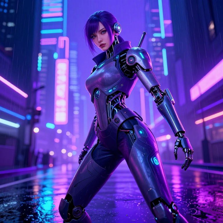 CGI image of a smiling woman with glowing, colorful lights on her futuristic armor, standing in a rainy night cityscape.