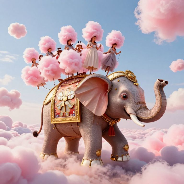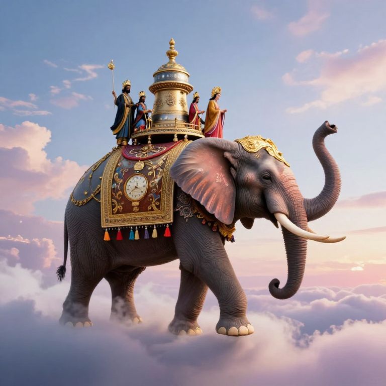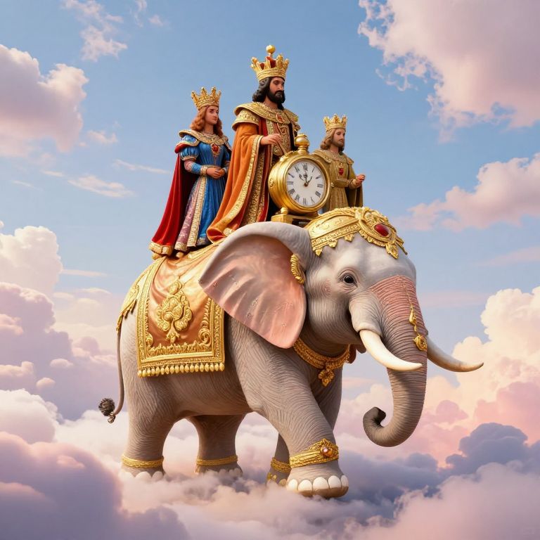 An opulent elephant adorned with golden embellishments and a grand clock parades serenely through a sky of fluffy, pastel clouds, bearing three regal figures in vibrant attire.