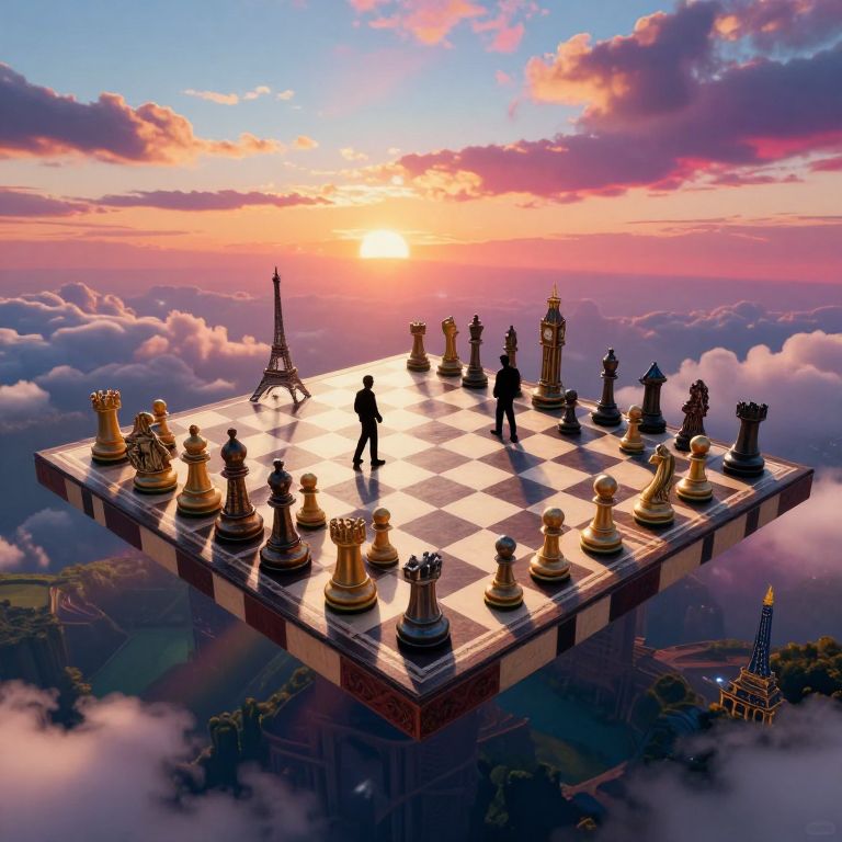 Depict an aerial view of a surreal chessboard set against a mesmerizing backdrop, where the sky seems to melt into vibrant hues. The chess pieces, designed as iconic world landmarks like the Eiffel Tower and Big Ben, are intricately detailed, creating an otherworldly atmosphere. Focus on two silhouetted figures engaged in a grandiose game atop a colossal, impossible chessboard that looms over the landscape below, capturing the dreamlike tension and wonder through dynamic light sources and enigmatic expressions.