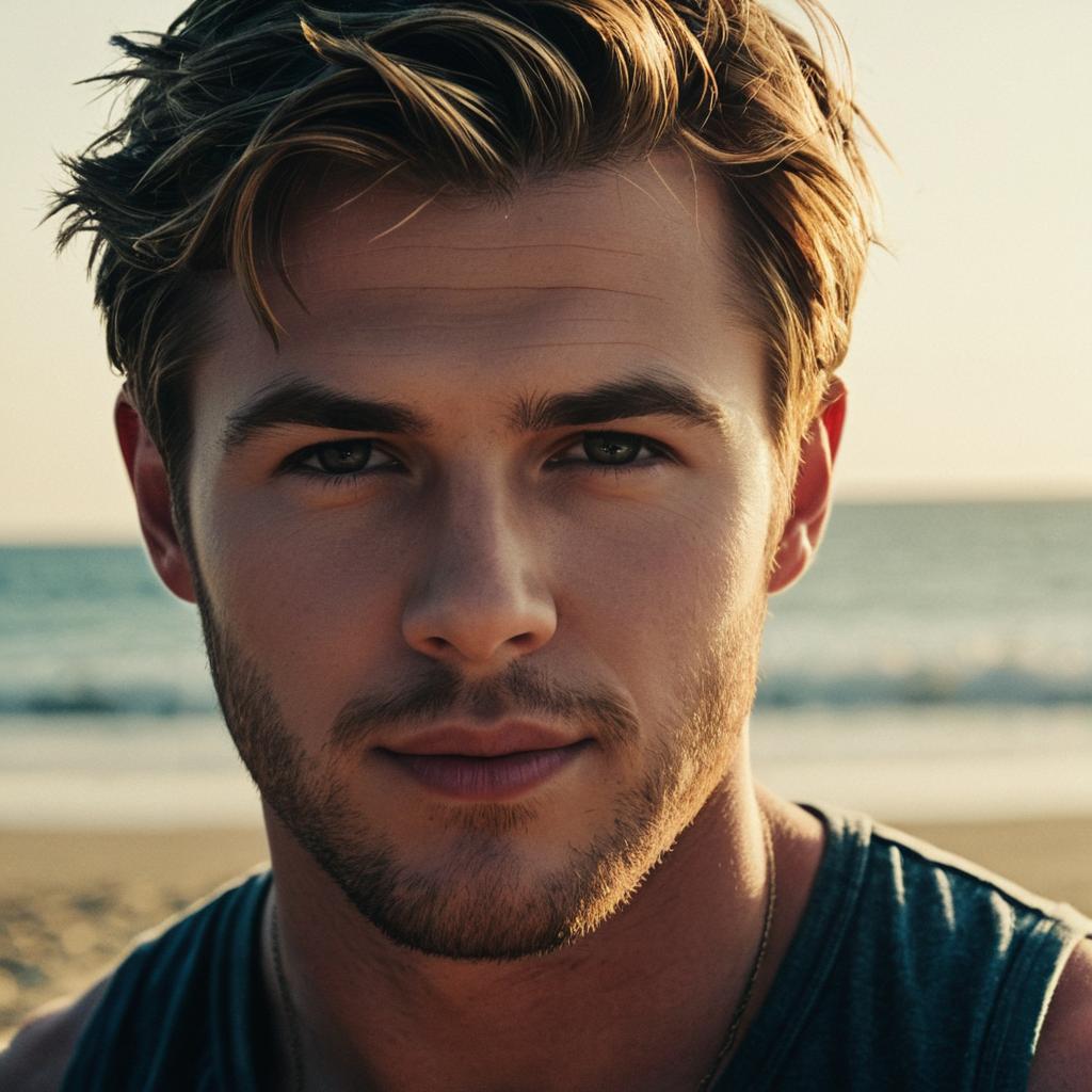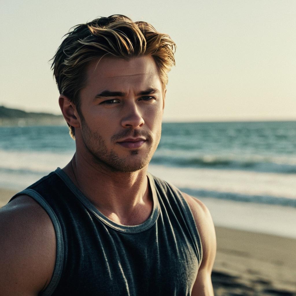 Middle-aged woman at the beach, cute, photogenic, sleeveless, upper body, golden hour lighting, he is a blend of chris hemsworth and finn oshea and damian lewis, optimistic, confident, amber aura, ultra high definition, extreme detail, perfect face, cinematic shot, american shot framing, photorealistic, movie still, cinematic photography, fashion photography, intricate detail, documentary photograph, flattering lighting:: style of David LaChapelle:: earth tones