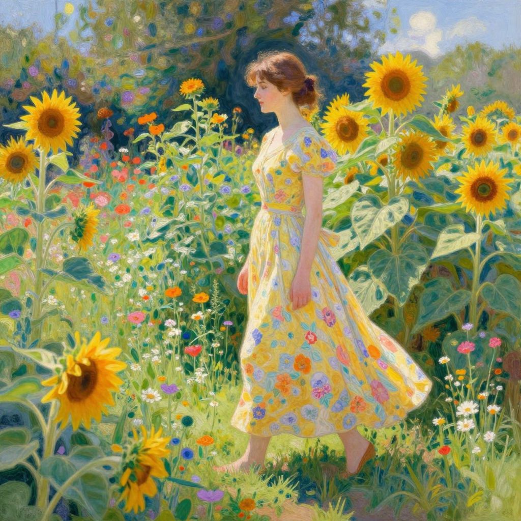 Digital painting of a fair-skinned woman in a yellow floral dress walking through a sunlit sunflower and wildflower field.