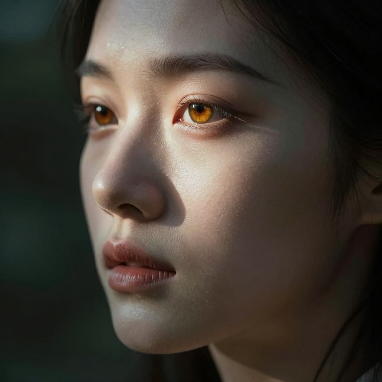 Craft a captivating fine art photograph portraying an enigmatic figure with amber eyes, reflecting light and shadow. The subject's face should be illuminated by soft, diffused sunlight from above, casting subtle highlights on their angular features to create a mesmerizing interplay of light and darkness. Capture this mysterious individual in an unusual profile view that hints at depth and character, evoking intrigue and empathy. This emotionally charged portrait invites viewers to explore the unseen layers within.