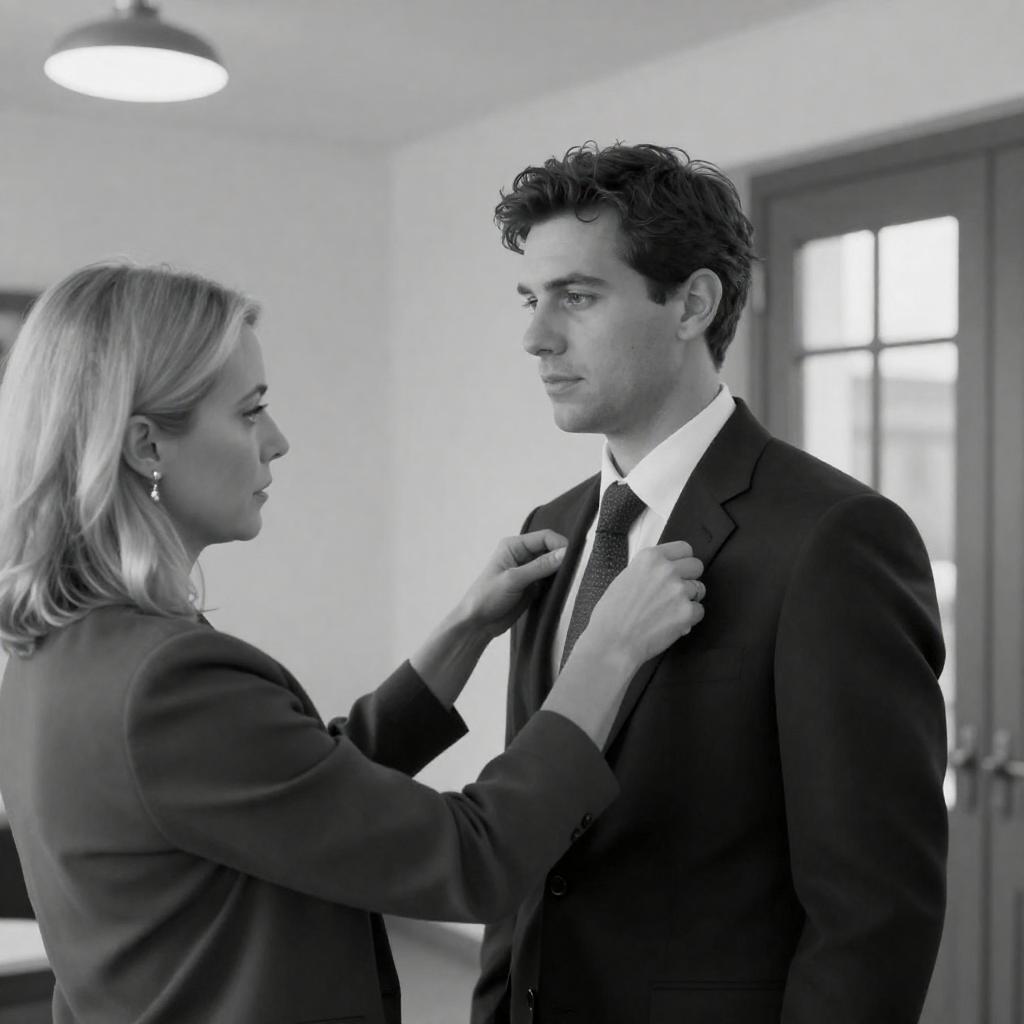 Black-and-white photograph of a man and woman in an indoor setting. The woman, with wavy hair and backless dark dress, stands facing the man, covering her chest with the dress. The man, with short dark hair and open mouth, wears a white dress shirt and dark pants. Background includes a floral arrangement, table, and chair. The man looks surprised, the woman looks at him.