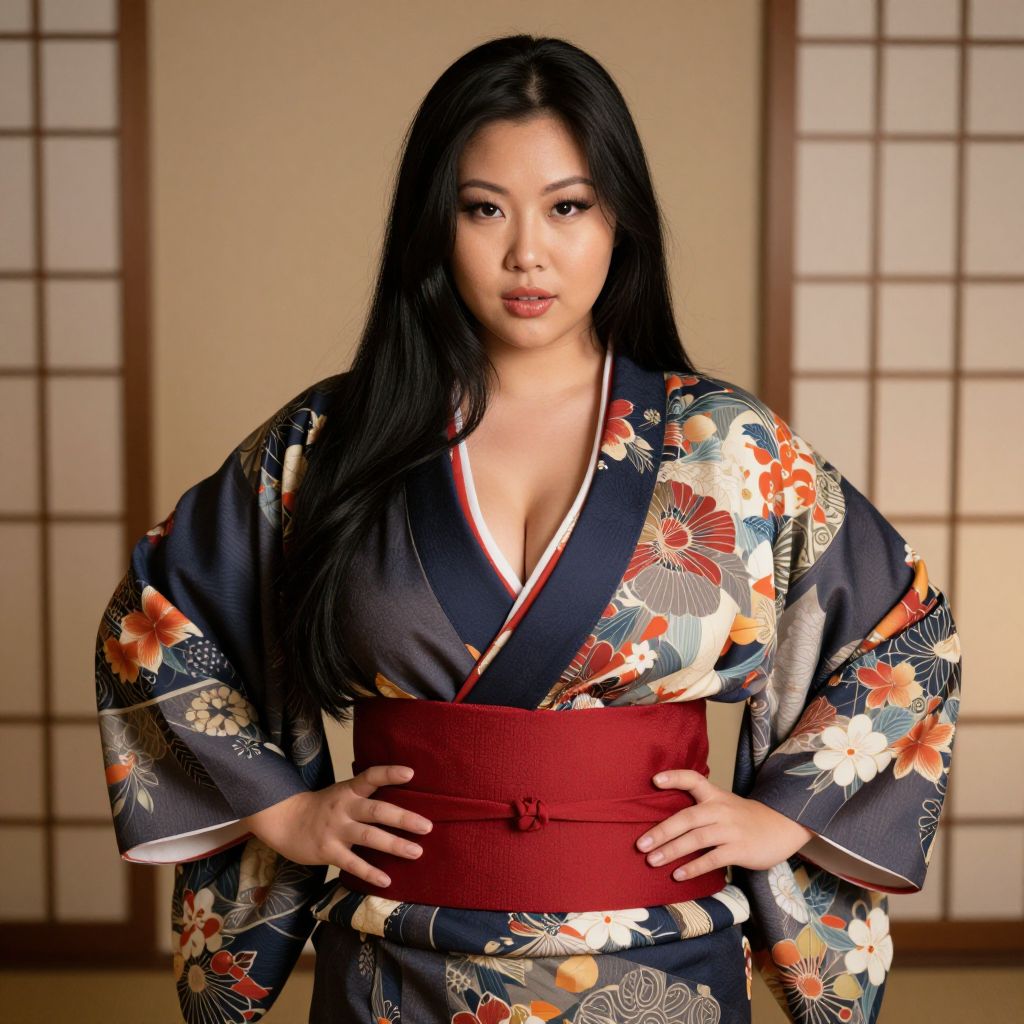 An Asian woman with long black hair, voluptuous figure, big tits and sexy, wearing a traditional kimono with intricate floral and geometric designs, paired with a rich red belt. She stands confidently with her hands on her hips, gazing directly at the camera, exuding elegance and charm in a serene, softly lit indoor setting. The atmosphere is warm and inviting, highlighting her graceful posture and striking features.