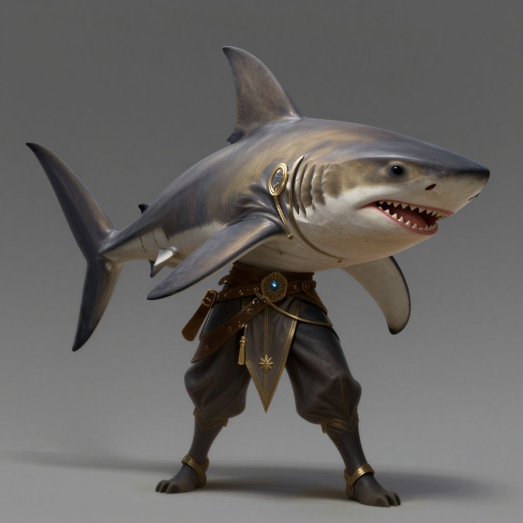 Digital CGI of an anthropomorphic shark warrior, gray and silver, wearing dark pants, gold accessories, and standing on two legs, against a gradient gray
