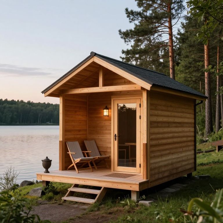 Wooden sauna cabin perched gracefully beside a serene lake, featuring a small deck with two lounge chairs and a decorative urn, surrounded by lush greenery and towering pine trees under a tranquil sky.