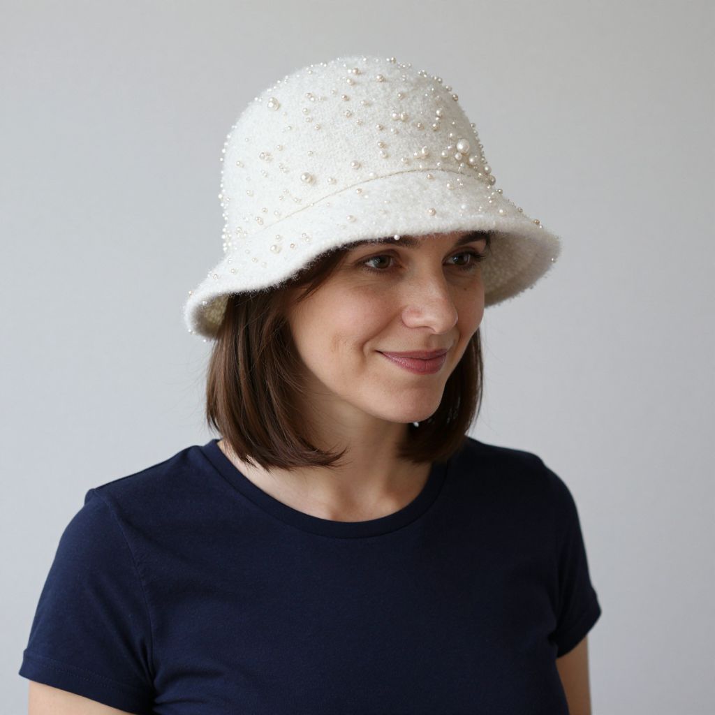 Woman wearing a handmade pearled wool hat in white, crafted by Julie Sinden Handmade, smiles softly while dressed in a dark navy T-shirt against a plain background.