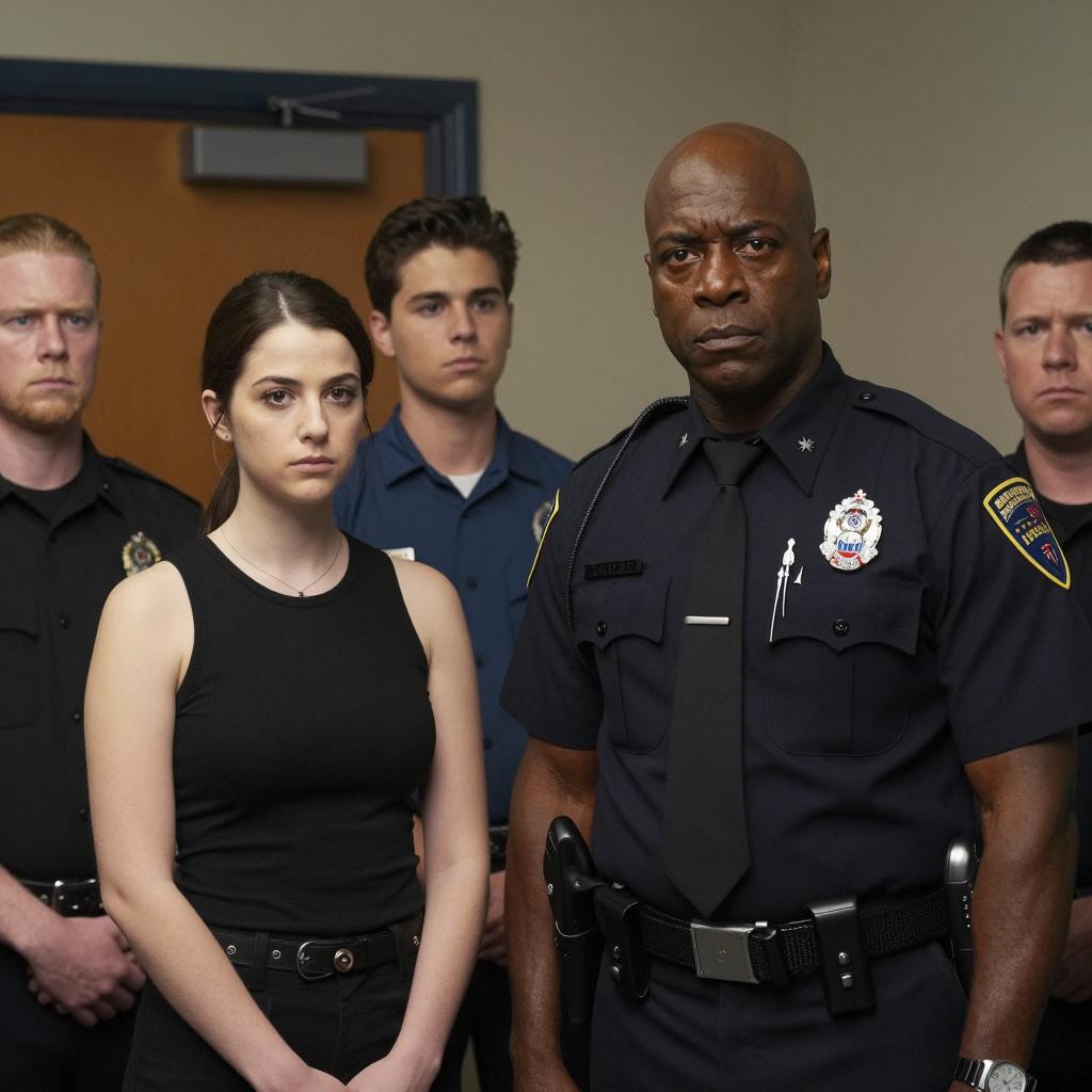 Group of five people in a dimly lit room. Bald black man in dark blue police uniform with medals, intense expression, stands in front. Young woman with dark hair in black sleeveless top, serious expression, to his left. Young man with dark hair in blue shirt, name tag "R.I.P.D.", behind her. Two other individuals, partially visible, to left and right. Wooden door in background.