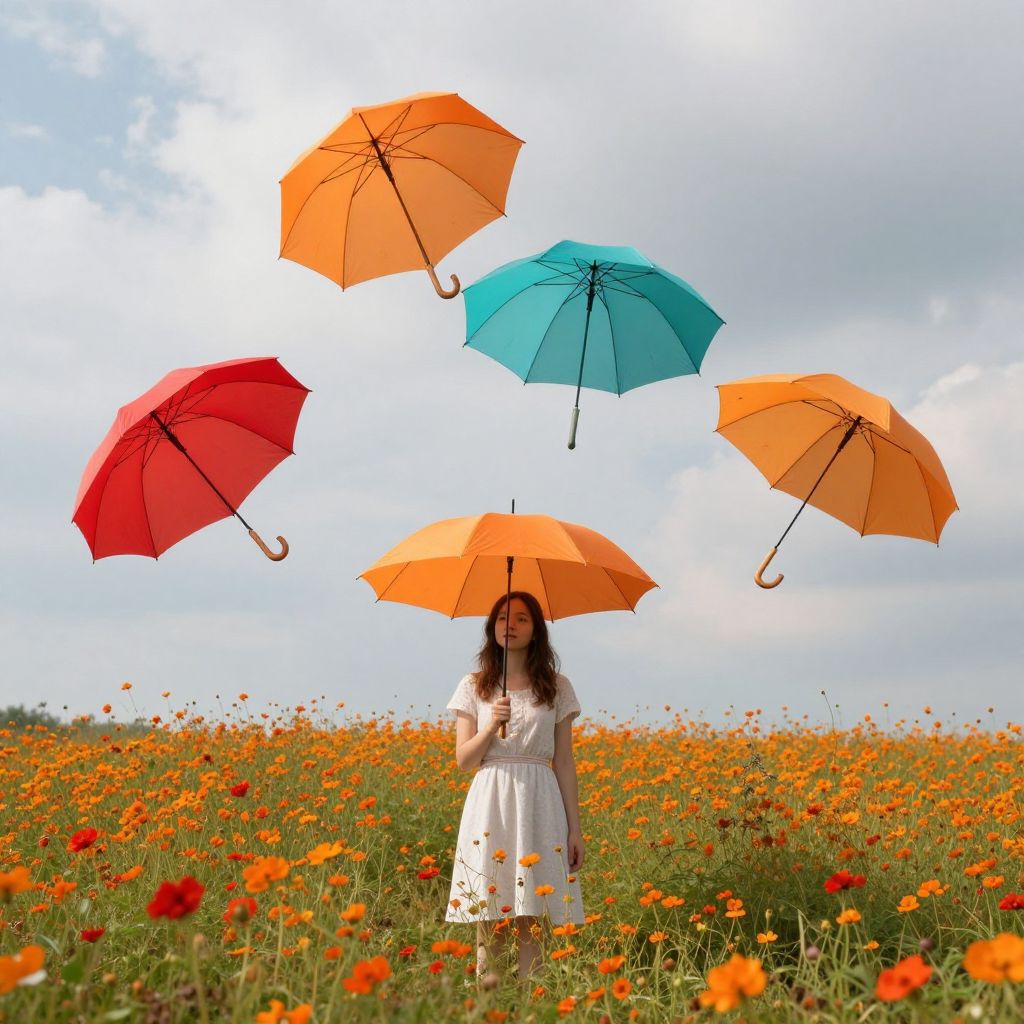 A young woman stands amidst a vibrant field of orange and red wildflowers, holding a bright orange umbrella while four additional umbrellas—red, orange, teal, and another orange—float gracefully above her, each casting a whimsical shadow against the soft, cloud-dotted sky.