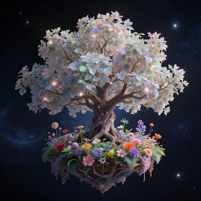 Digital artwork of a floating, crystal-encrusted floral island with glowing blue center, surrounded by colorful flowers, butterflies, and birds.