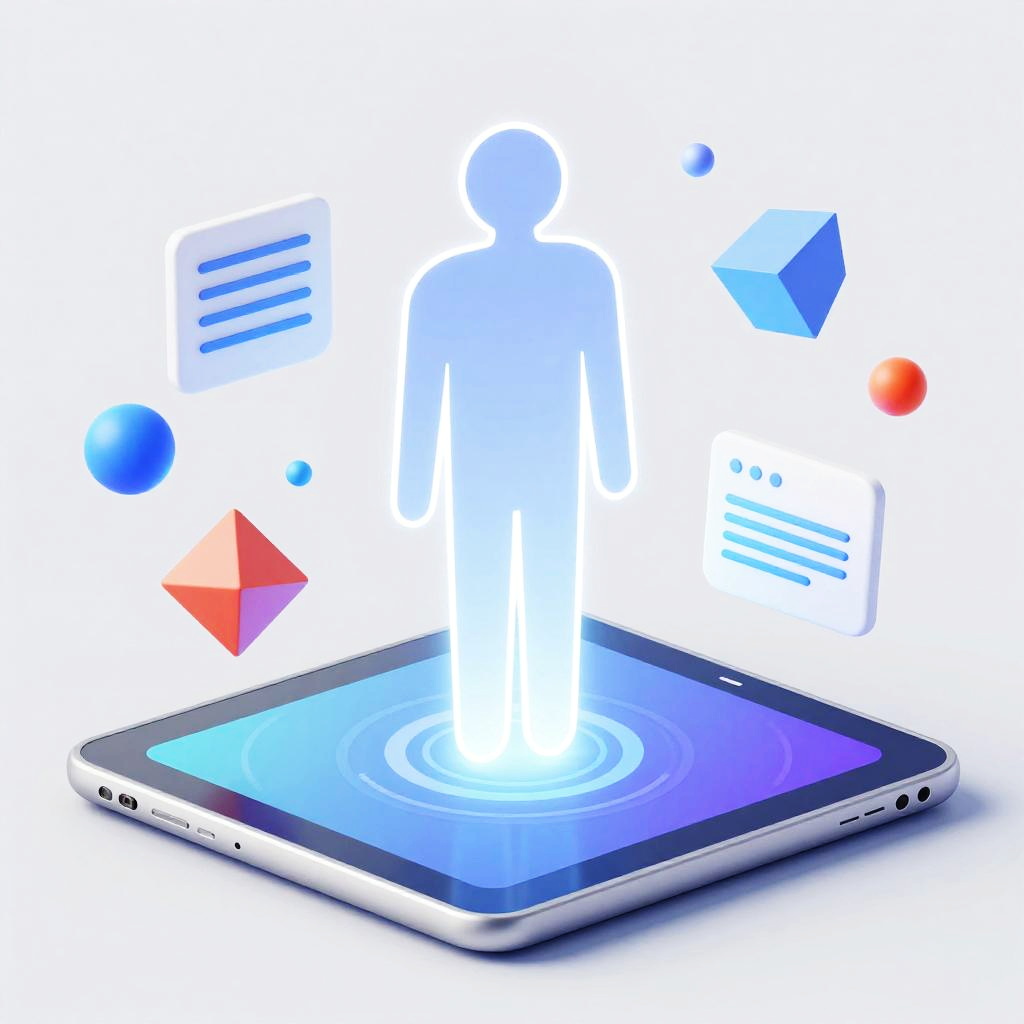 Digital silhouette of a standing person in dark blue, centered on a white background with app icons on both sides.